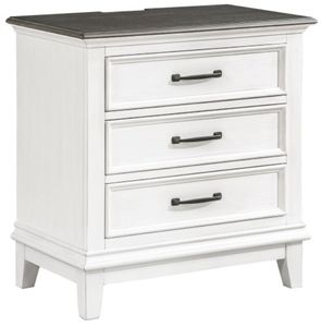La quincaillerie à barre qui se trouve devant les tiroirs de la table de nuit offre un contraste distinct et complémentaire à la finition de la collection. La fonctionnalité moderne de la table de nuit se présente sous la forme de prises USB et d'alimentation montées à l'arrière, permettant un accès pratique à vos appareils électroniques pendant qu'ils se rechargent.